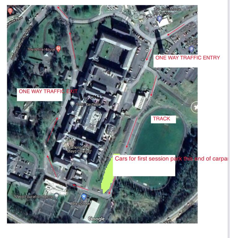 Use the one way system for cars. Enter by water tower and exit by GMIT. Those at the 11 o’clock session should park over at clubhouse.