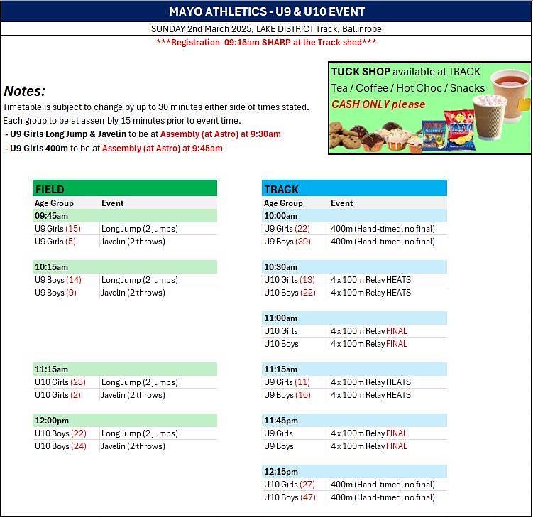 Timetable for the U9 and U10 event Mar 1, 2025 The timetable for the Mayo Athletics event tomorrow is available now. The first events are long jump and 400m for U9s. Meet at the Astro pitch at 9:30